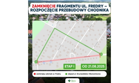 Od 21 sierpnia 2025 r. nastąpi zamknięcie odcinka ul. Fredry w Lędzinach. Zamknięcie drogi związane jest z realizacją zadania pn. „Przebudowa ul. Fredry w Lędzinach w zakresie przebudowy chodnika”.