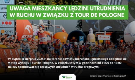 W piątek, 8 sierpnia 2025 r. na terenie powiatu bieruńsko-lędzińskiego odbędzie się V etap wyścigu Tour de Pologne. W związku z tym należy spodziewać się czasowych utrudnień w ruchu drogowym.