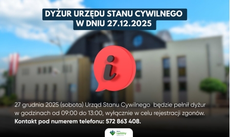 Informujemy, że 27 grudnia 2025 (sobota) Urząd Stanu Cywilnego będzie pełnił dyżur w godzinach od 09:00 do 13:00, wyłącznie w celu rejestracji zgonów.