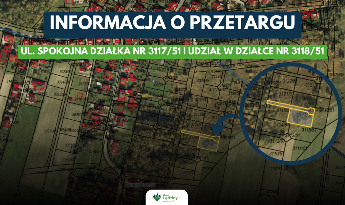 - Wadium należy wpłacić do 6 października 2025 r. na rachunek bankowy Urzędu Miasta Lędziny (ING Bank Śląski SA Katowice, nr konta 04 1050 1214 1000 0024 1111 9239), z dopiskiem: „wadium na działkę nr 3117/51 wraz z udziałem w działce 3118/51, położonych w Lędzinach przy ul. Spokojnej”.