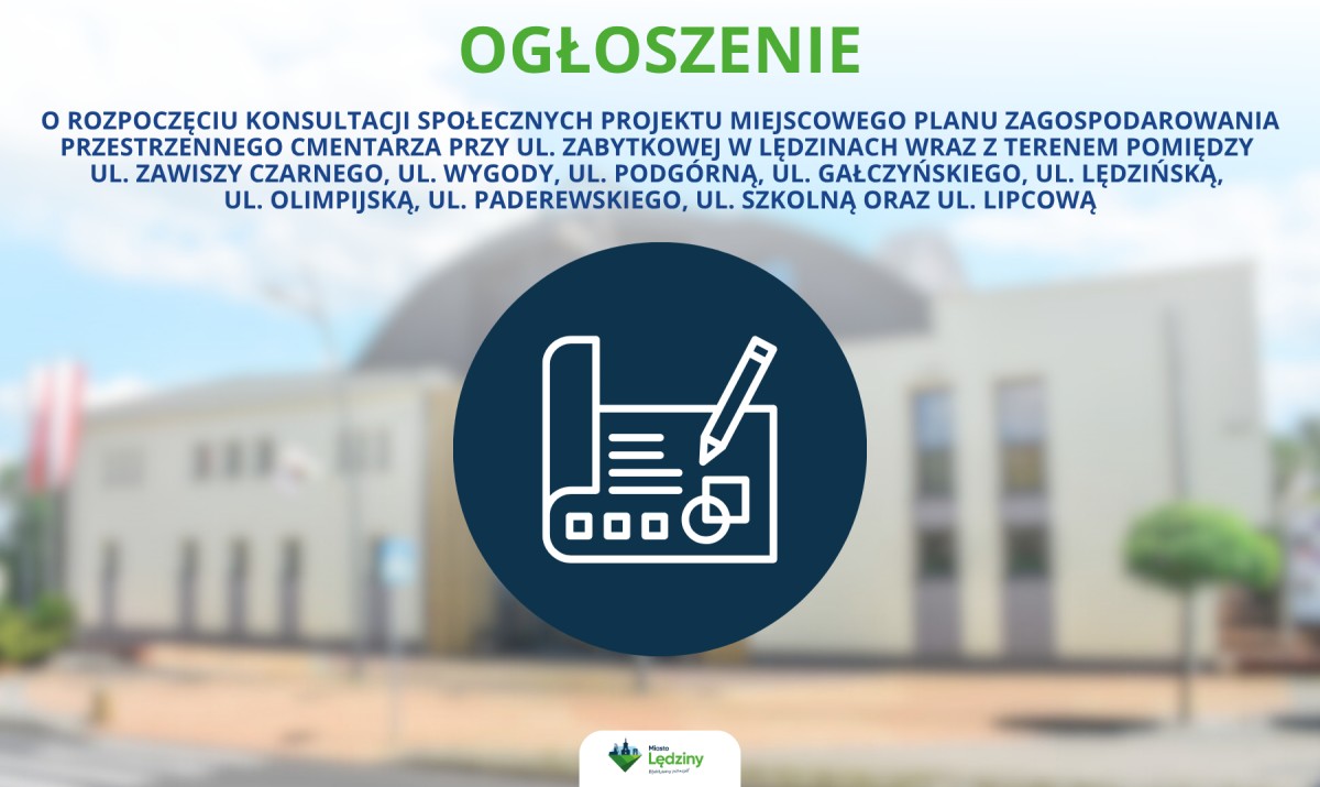 OGŁOSZENIE o rozpoczęciu konsultacji społecznych projektu miejscowego planu zagospodarowania przestrzennego cmentarza przy ul. Zabytkowej w Lędzinach wraz z terenem pomiędzy ul. Zawiszy Czarnego, ul. Wygody, ul. Podgórną, ul. Gałczyńskiego, ul. Lędzińską,