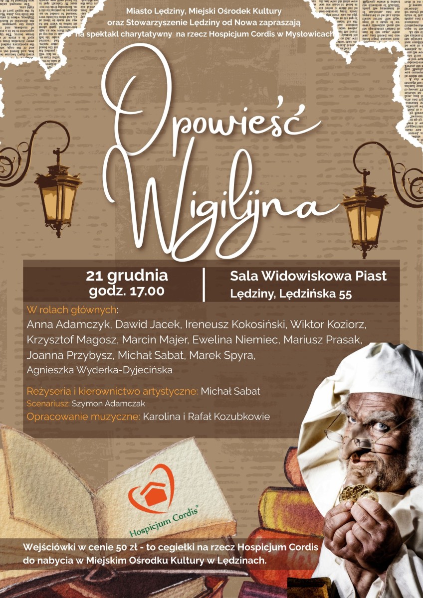 Już 21 grudnia o godzinie 17:00 w Sali Widowiskowej Piast (Lędziny, Lędzińska 55) odbędzie się charytatywny spektakl teatralny na rzecz Hospicjum Cordis w Mysłowicach. Na deskach sceny zobaczymy adaptację ponadczasowej, wzruszającej historii – „Opowieści Wigilijnej”.