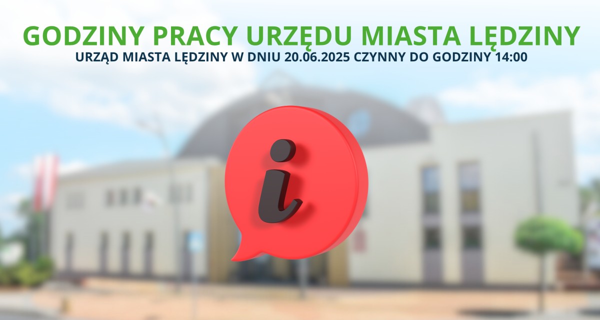 Informujemy, że w dniu 20.06.2025 r. (piątek) Urząd Miasta Lędziny jest czynny dla mieszkańców w godzinach 7:30-14:00.