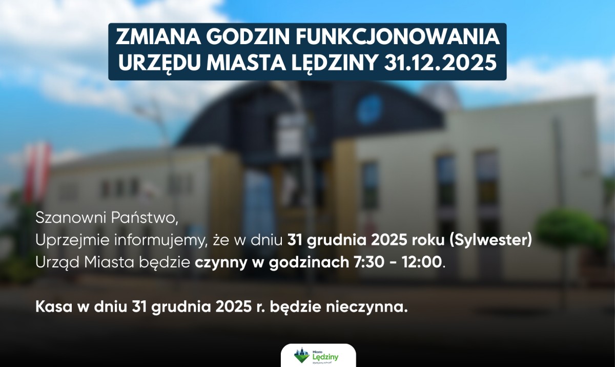 Uprzejmie przypominamy, że w dniu 31 grudnia 2025 roku (Sylwester) Urząd Miasta będzie czynny w godzinach 7:30 - 12:00.