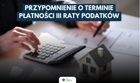 Szanowni mieszkańcy, Przypominamy o zbliżającym się terminie płatności III raty podatku od nieruchomości, podatku rolnego, podatku leśnego, który upływa w dniu 15.09.2025r.