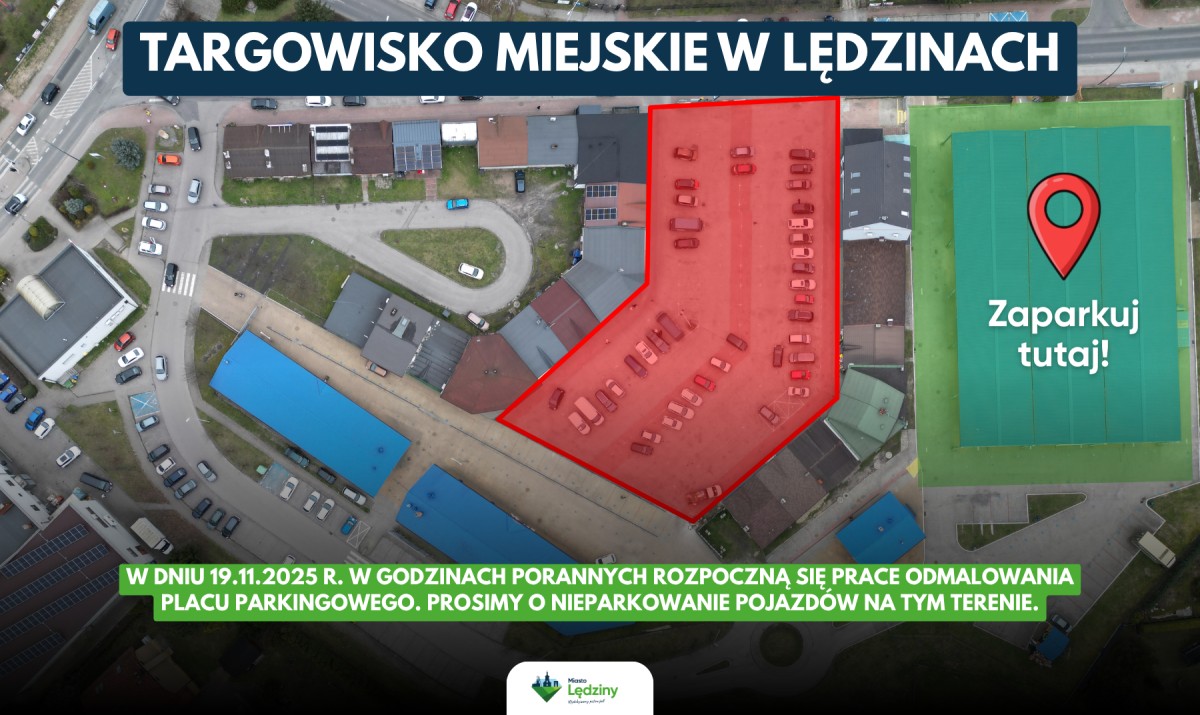 W dniu 19 listopada 2025 r., w godzinach porannych, rozpoczną się prace związane z odmalowaniem placu parkingowego pomiędzy budynkami 6Z a 8 na terenie Targowiska Miejskiego w Lędzinach.