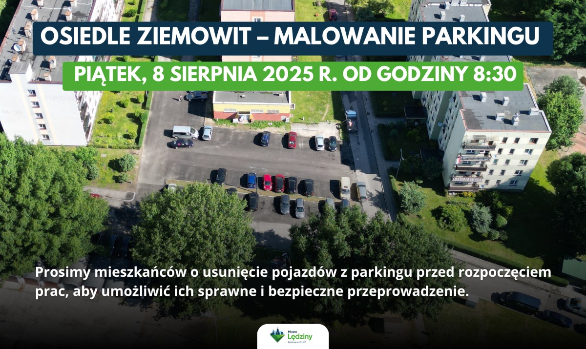 Uprzejmie informujemy, że w piątek, 8 sierpnia 2025 r. od godziny 8:30 prowadzone będą prace związane z malowaniem oznakowania poziomego na parkingu na Osiedlu Ziemowit.