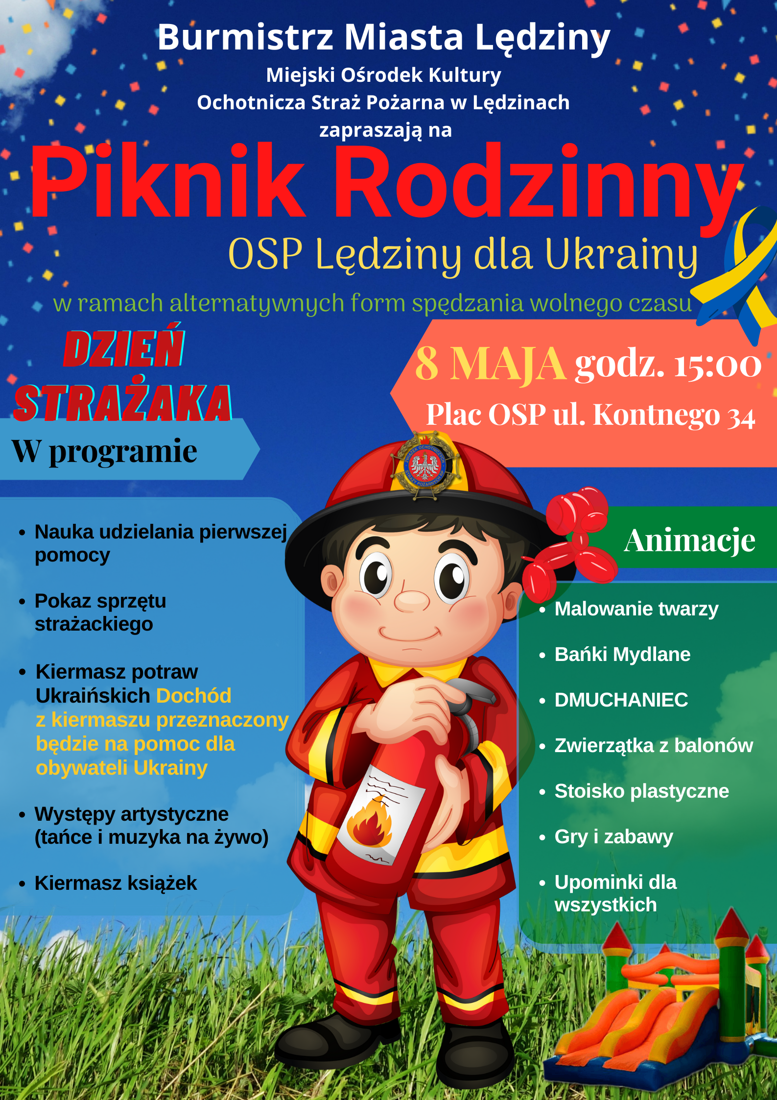 Planowane są animacje dla dzieci, które skorzystają także z dmuchanej zjeżdżalni. Gorące emocje zapewnią strażacy z OSP z gminy Lędziny, a o podniebienia zadbają Obywatele Ukrainy którzy przygotują kiermasz potraw. Dochód z kiermaszu przeznaczony będzie na pomoc obywatelom Ukrainy.