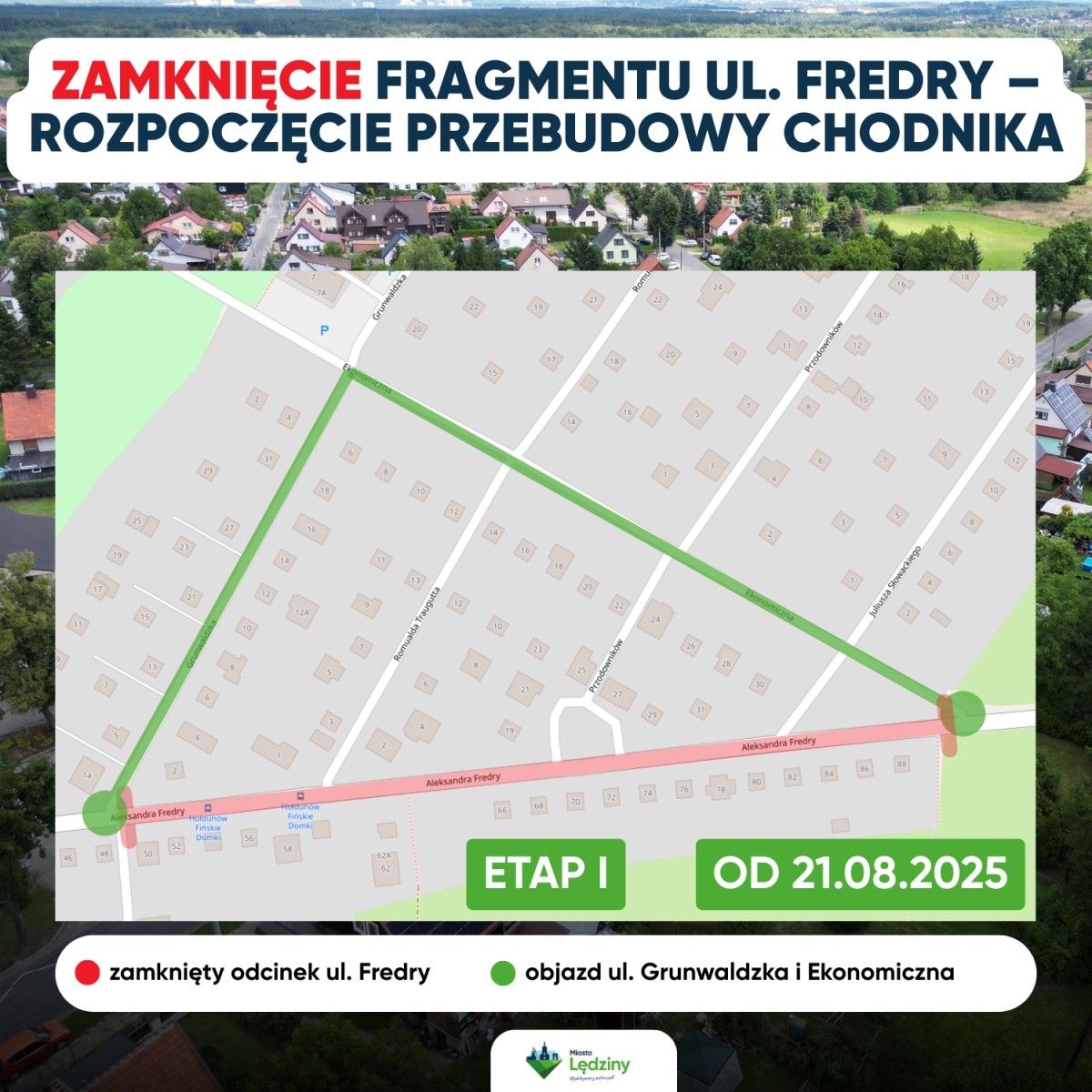 Od 21 sierpnia 2025 r. nastąpi zamknięcie odcinka ul. Fredry w Lędzinach. Zamknięcie drogi związane jest z realizacją zadania pn. „Przebudowa ul. Fredry w Lędzinach w zakresie przebudowy chodnika”.