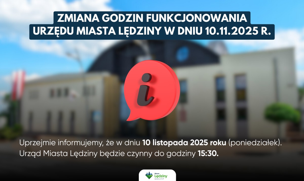 Uprzejmie informujemy, że w poniedziałek, 10 listopada 2025 r., Urząd Miasta Lędziny będzie czynny do godziny 15:30.