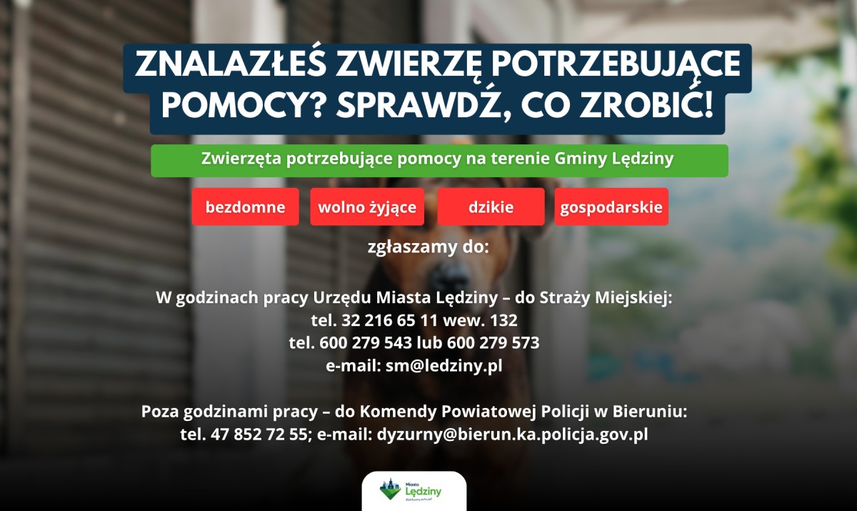 Na terenie miasta Lędziny, jeśli zauważysz zwierzę bez opieki lub wymagające interwencji – psa, kota, ale również zwierzę dzikie, wolno żyjące czy gospodarskie – prosimy o podjęcie następujących kroków: